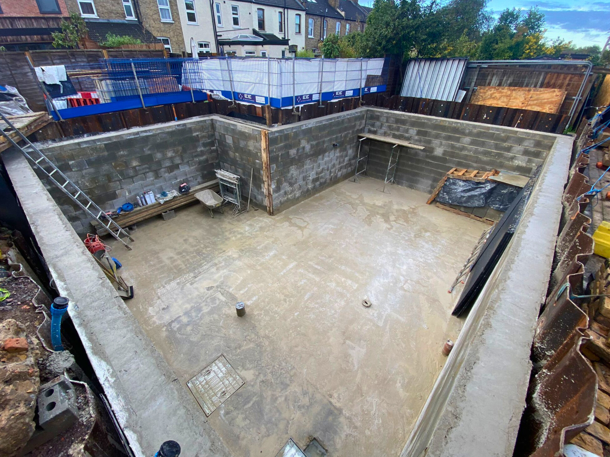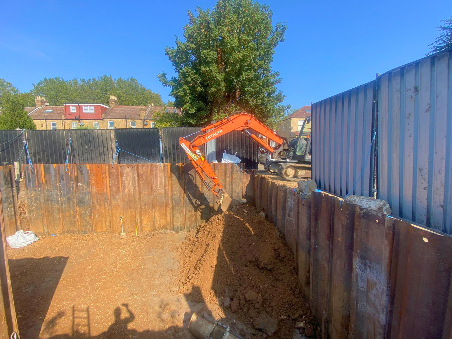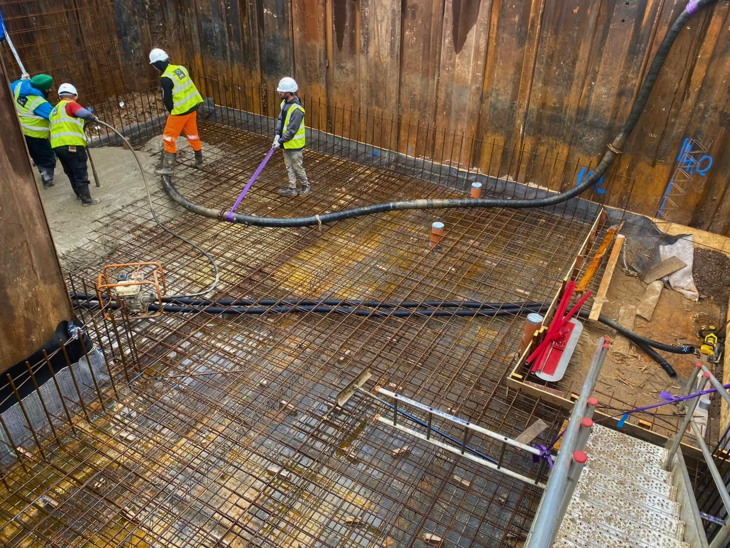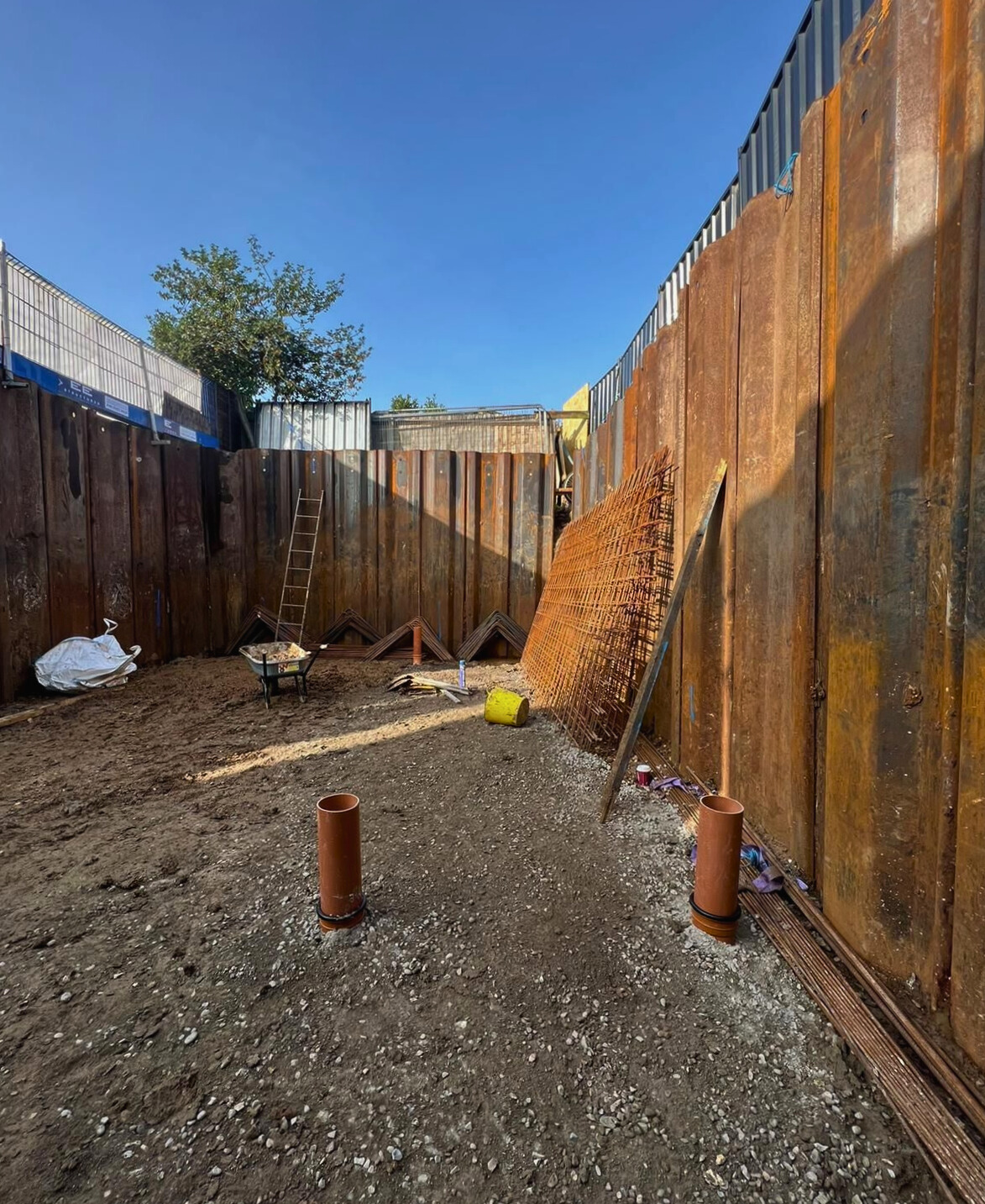 Basement / sheet pile construction including drainage connections to road and s278works, substructure hollow core block work and in-situ concrete works.