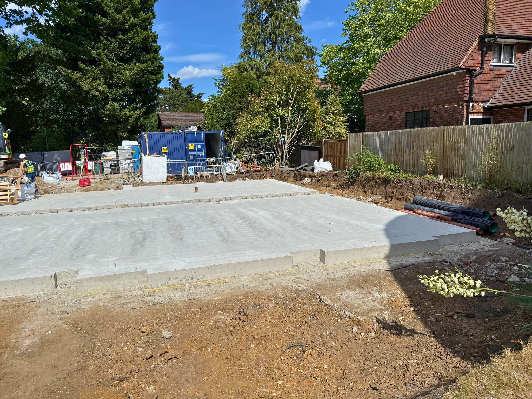 Below-ground drainage and utility services have now been installed, reinforcement mesh is in, and the ground-floor slab has been cast, setting a solid base for the next phase.